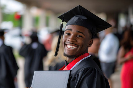 Group of joyful black graduates celebrating with beaming smiles, clad in caps and gowns