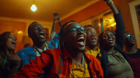 A joyful group celebration with singing and dancing in a cozy indoor space during an evening gathering with friends