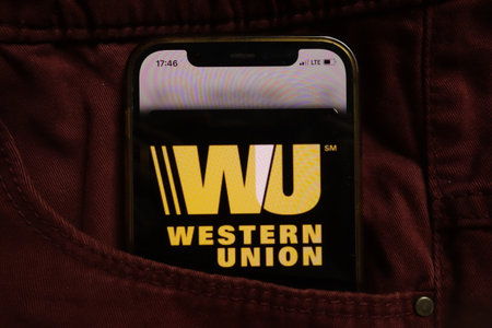 KONSKIE, POLAND - September 04, 2021: Western Union Company logo displayed on mobile phone hidden in jeans pocket
