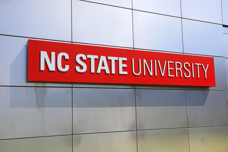 RALEIGH, NC, USA - SEPTEMBER 04, 2020 : Main Entrance Sign on shiny wall at North Carolina State University in Raleigh, North Carolina. It is largest university in both North and South Carolina.