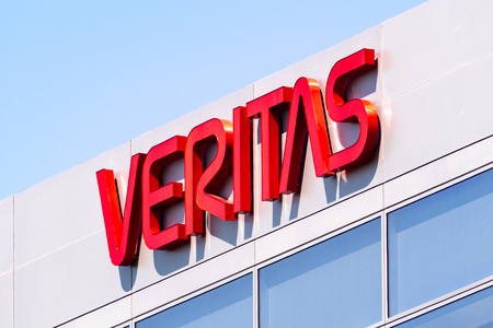 May 8, 2019 Santa Clara / CA / USA - Veritas logo on the facade of the Company's headquarters in Silicon Valley; Veritas Technologies LLC is an American international data management company