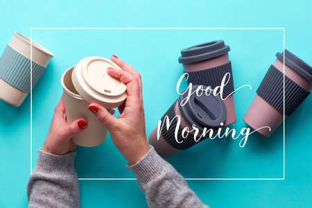 Assorted bamboo travel reusable coffee or tea cups or mags. Text Good morning in frame. Hands open silicon lid. Eco friendly zero waste solution for low impact sustainable lifestyle.