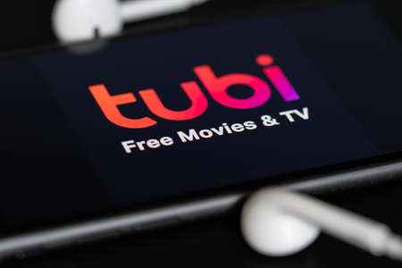 Rheinbach, Germany April 28, 2022, The brand logo of the streaming service Tubi on the display of a smartphone with headphones (focus on the brand logo)