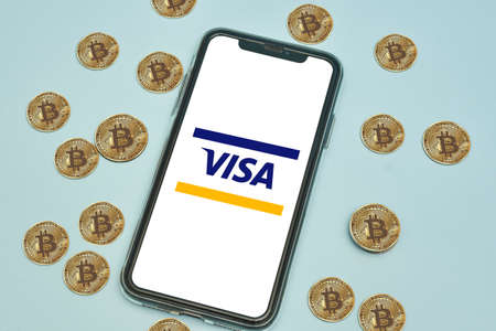 Tashkent, Uzbekistan - April 2, 2021: Visa logo app on mobile phone screen and pile of bitcoins cryptocurrency. Symbol of cryptocurrency rolling out in traditional financial sector