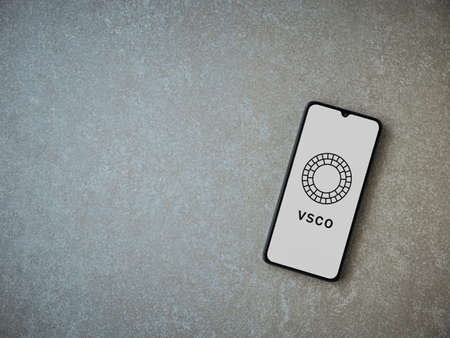 Lod, Israel - July 8, 2020: VSCO - Photo and Video Editor app launch screen with logo on the display of a black mobile smartphone on ceramic stone background. Top view flat lay with copy space.
