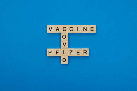 Horizontal color image with a front view of a vaccine 90% effective against the coronavirus pandemic written with wooden letters on a blue background. Covid concept.