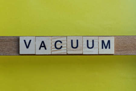 gray word vacuum in small square wooden letters with black font on a yellow background