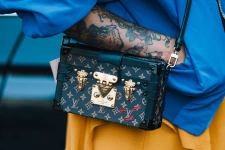 Milan, Italy - September 22, 2017: Tatoo girl with a stylish outfit wearing a Louis Vouitton luxuty handbag.