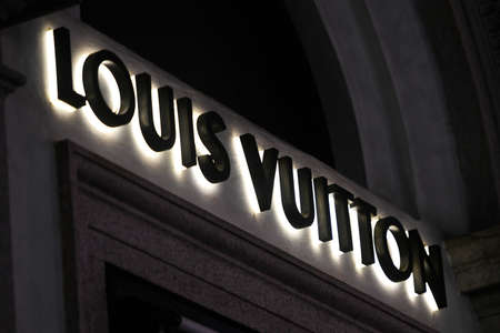 Milan, Italy - September 24, 2021: Louis Vuitton logo displayed on a facade of a store in Milan.