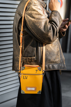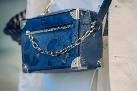 Milan, Italy - September, 22, 2022: man wears vertical box trunk from Louis Vuitton, street style outfit details