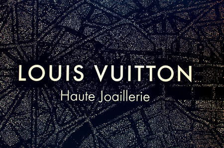 Paris, France 03-17-2012 : Paris, the a close up of a louis vuitton symbol at Their store in Place Vendome, written and diamonds that form the map of Paris