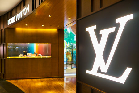SINGAPORE - CIRCA APRIL, 2019: close up shot of LV sign at Louis Vuitton store in the Shoppes at Marina Bay Sands.