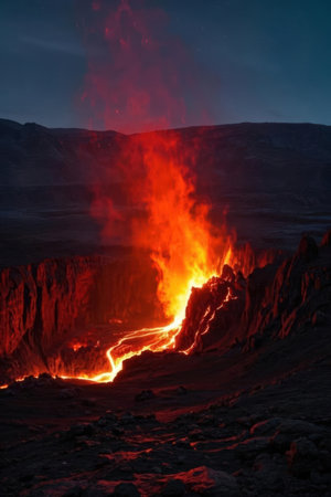 A stunning view of an erupting volcano at night captures the dynamic flow of lava and swirling ash under a mesmerizing twilight sky. Nature's raw power revealed.