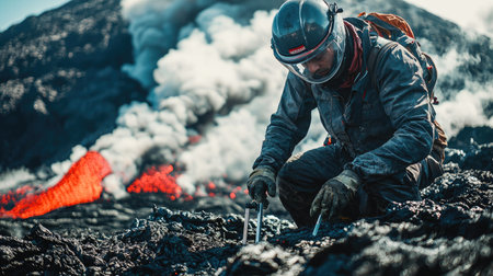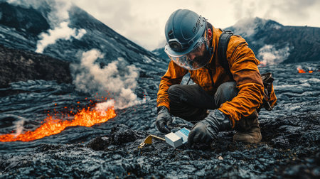 Volcanologist with Protective Gear Installing Seismometer Near Lava Flow