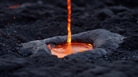 A striking image of molten lava flowing from a crater into dark volcanic rock, showcasing the vibrant orange glow against the solid terrain, highlighting nature's raw power.