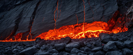 Fiery digital artwork in a dramatic style with intense orange luminescence piercing dark volcanic expanses, capturing raw primal energy through stylized heat waves and molten contours. Perfect for dynamic wallpapers, gaming interfaces, sci-fi posters, environmental campaigns, and abstract textures in design projects. Versatile for creative industries seeking ... AI-generated digital illustration. AI-generated illustration.