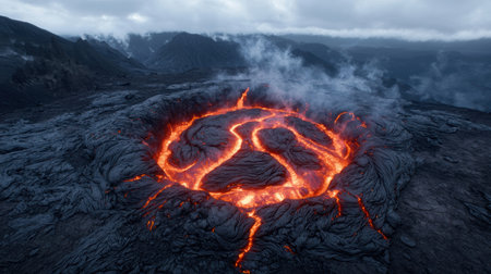 High aerial view capturing the contrast between fiery lava flows and dark volcanic ash. AI generated.