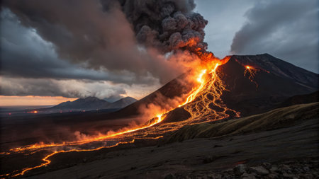 Fiery volcanic eruption with lava flows at night. Concept of active volcano, natural disaster, geological phenomenon, extreme environment.