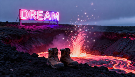 Hiking boots sit on cooled volcanic rock beside a glowing lava stream and erupting sparks, with a neon DREAM sign on the ridge and open sky providing empty space for text or graphic elements