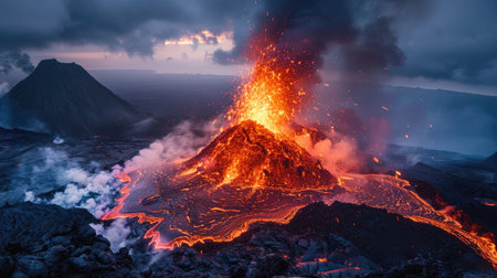 A powerful volcanic eruption is taking place, with molten lava flowing from the crater while thick clouds of ash billow into the sky. The fiery glow illuminates the surrounding landscape at dusk