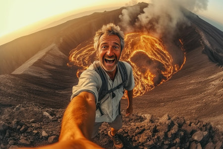 Generative AI : A caucasian young traveller takes a selfie photo hiking a volcano on a canary island Holding with two hands