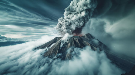 Volcano eruption in the clouds, panoramic view of the volcano