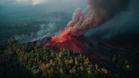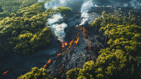 This stunning aerial view captures a volcanic eruption with flowing lava, thick smoke, and vibrant greenery, showcasing the raw power of nature in all its glory.