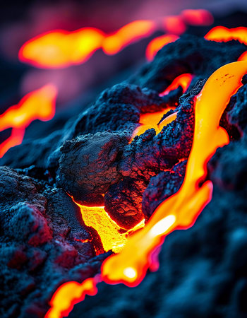 Molten Lava Cracks Flowing Through Solidified Black Volcanic Rock, High Contrast, Vibrant Colors