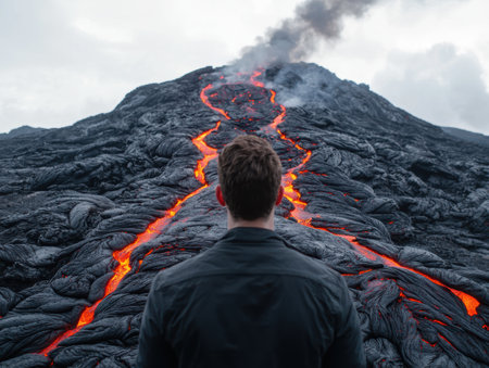 A volcanologist scientist with his back turned observes the lava flow from a distant volcanic eruption as it slowly solidifies