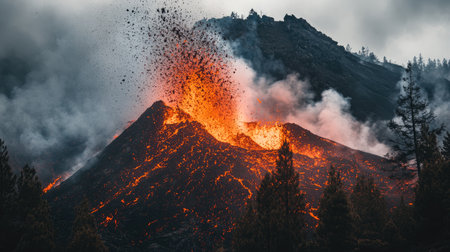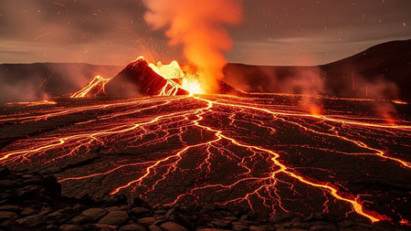 volcanic eruption, with lava flow streaming down the side of a volcano, setting fire to the surrounding landscape, created with generative ai