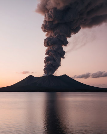 AI Generated. Volcanic Eruption with Smoke and Ash Over Calm Waters at Dusk