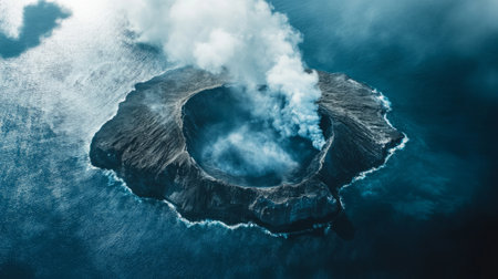 Volcanic island seen from above, with steam rising from the crater generative ai