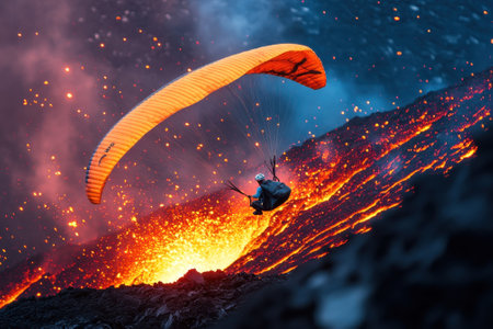 A paraglider soars above a volcano spewing lava, surrounded by a stunning yet hazardous landscape.