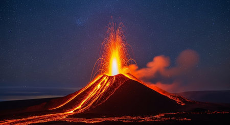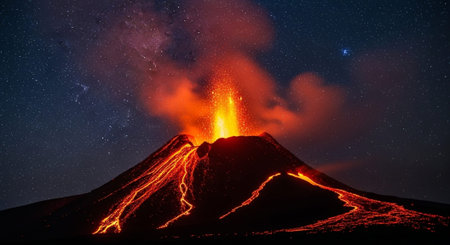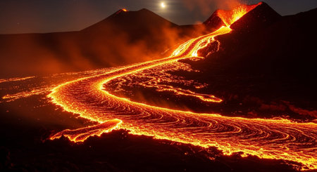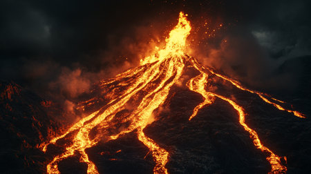 Fiery volcanic eruption with lava flows at night. Concept of active volcano, natural disaster, geological phenomenon, extreme environment.