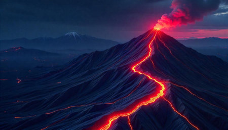 A dramatic volcanic eruption at night with lava flows and smoke