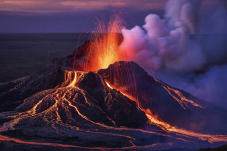 Stunning eruption of a volcano, showcasing fiery lava and plumes of smoke against a twilight sky.