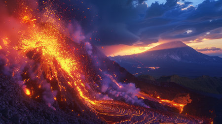 captivating scene of an active volcanic eruption, showcasing molten lava, smoke plumes, and fiery glow beneath a dramatic evening sky, exuding intense energy and natural grandeur.