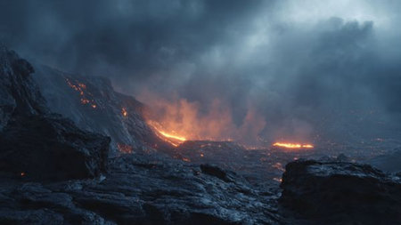 Volcanic eruption with lava and ash, fiery landscape image