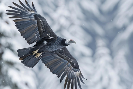 Bald eagle soars gracefully with a snowy forest background