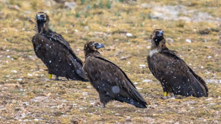 Cinereous vulture (Aegypius monachus) three birds sitting on ground in Spanish Pyrenees, Catalonia, Spain. April. This large raptorial bird is distributed through much of Eurasia. Also known as the black vulture, or monk vulture.