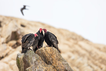 Turkey vultures sit on the rocks of the Balestas. Paracas Islands, Peru