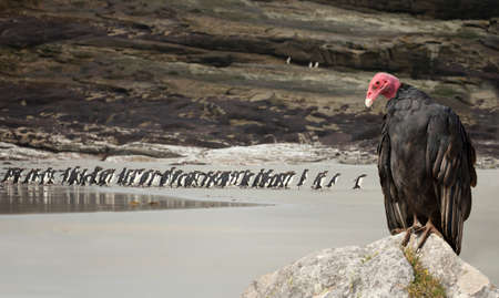 Close up of a Turkey vulture (Cathartes aura) watching rockhopper penguins on the coastal area of Falkland Islands.