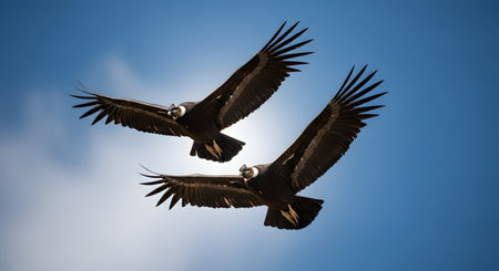 Two majestic Andean condors soar gracefully in a bright blue sky with wispy clouds. Their massive wings are fully extended, showcasing the power and freedom of these magnificent birds of prey in their natural habitat.