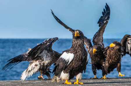 Steller's sea eagles. blue sky and ocean background. Scientific name: Haliaeetus pelagicus. natural habitat. winter season.