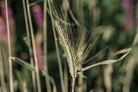 One spikelet of wheat in the field. Close-up photo with blurred background.