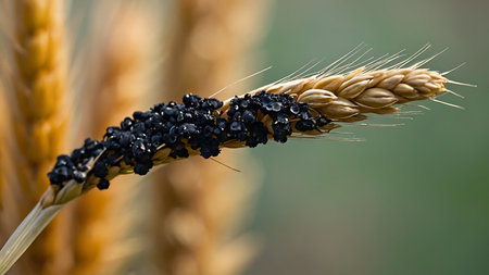 Golden wheat ear stands out in a pile of dark stones. The image emphasizes the contrast between the golden color of the grain and the dark color of the rocks. It focuses on the details of the grain and the textures of the stones, creating a beautiful visual contrast.