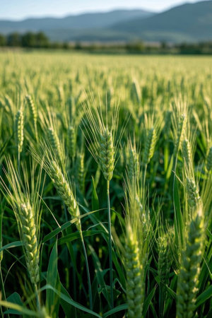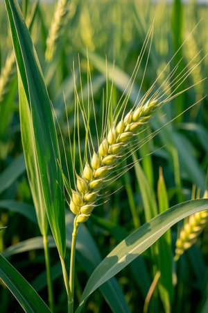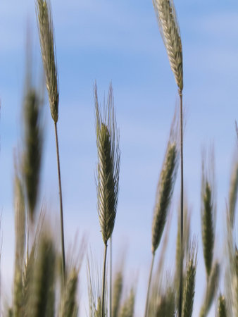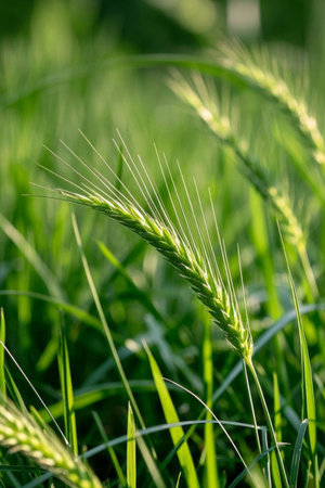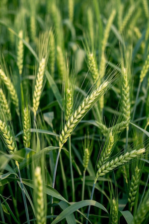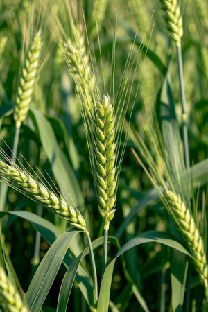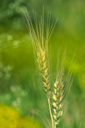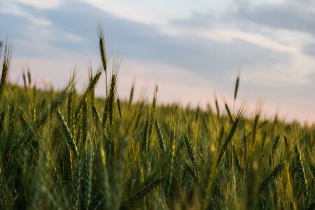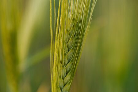 A close-up of some green ears in a wheat field ripening before harvest in a sunny day. ripening ears of wheat. Juicy fresh ears of young green wheat in spring. Green Wheat field. selective focus.