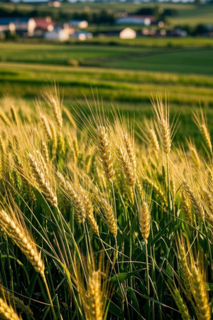 Close-up of ears of golden wheat of wheat field, serene scenery. Nature landscape background of ripening ears of wheat field. Rural rich harvest concept. Gen ai illustration. Copy ad text space