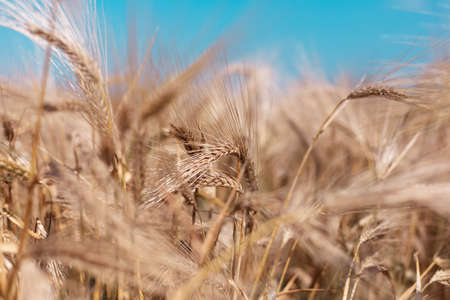 Golden wheat spikelets on field ripe crop before harvesting on summer day on blue sky background