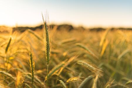Yellow ripe ears of wheat plants, beautiful field, golden hour - sunset. Harvest, nature, agriculture, harvesting concept.